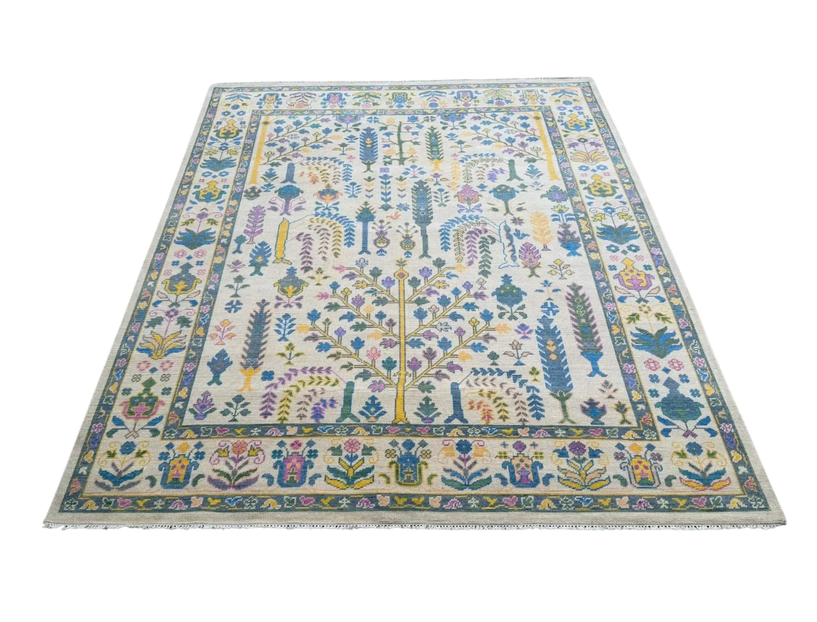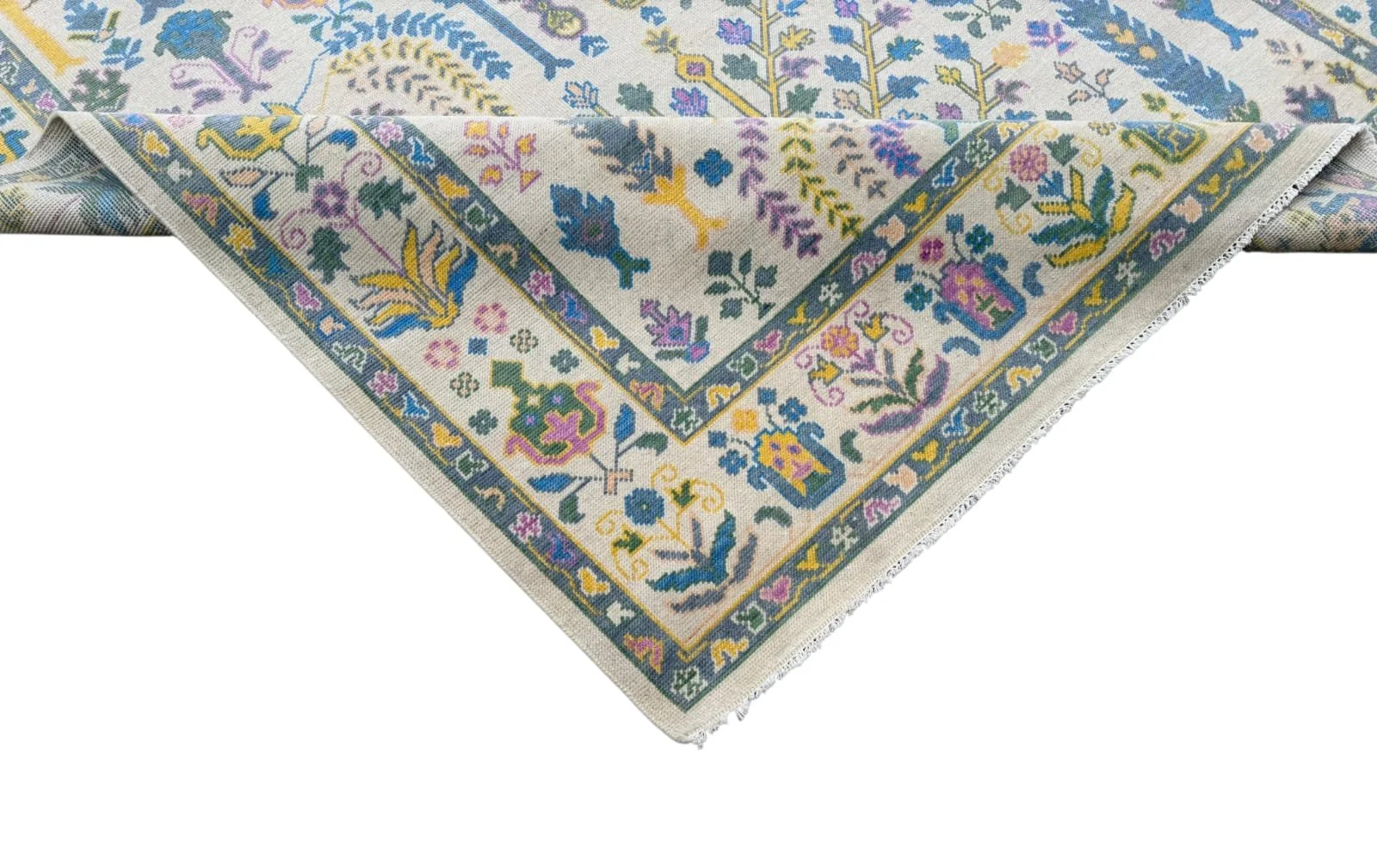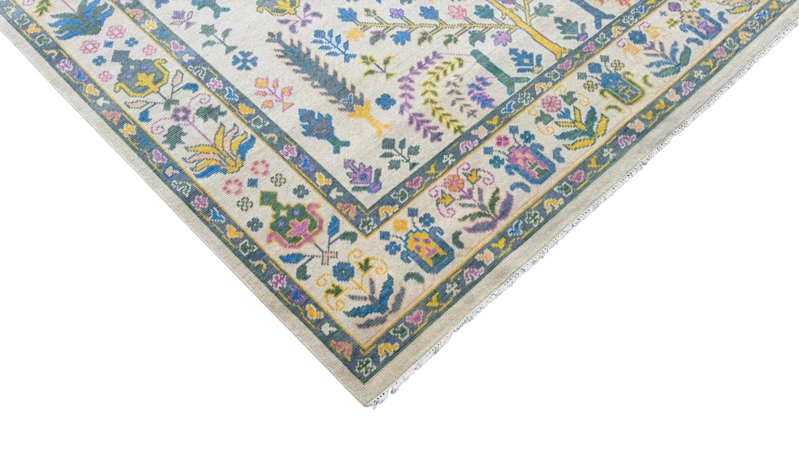 The Linden oushak rug features a warm beige foundation with soft blue and sage green accents, creating a calm, lived-in look. Its subtle geometric and floral motifs are gently faded for a vintage-inspired feel, while the detailed border adds structure and charm. Perfect for layering into relaxed, neutral spaces, this rug brings an easy, timeless character to living rooms, bedrooms, or everyday gathering areas.