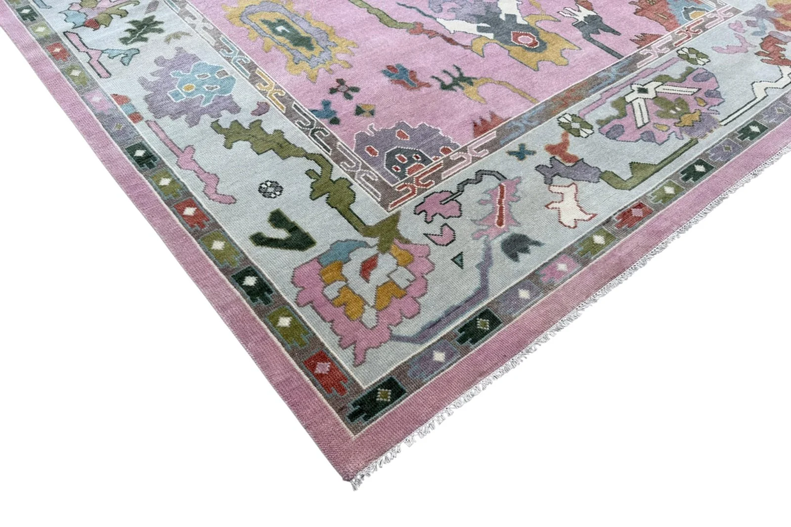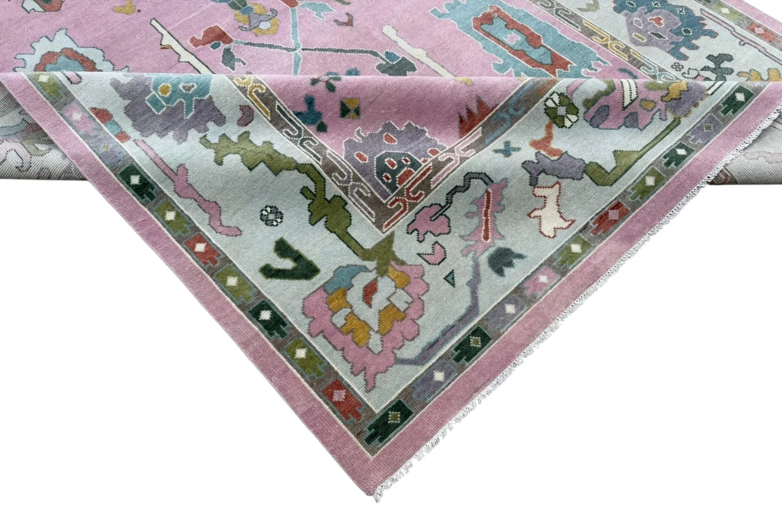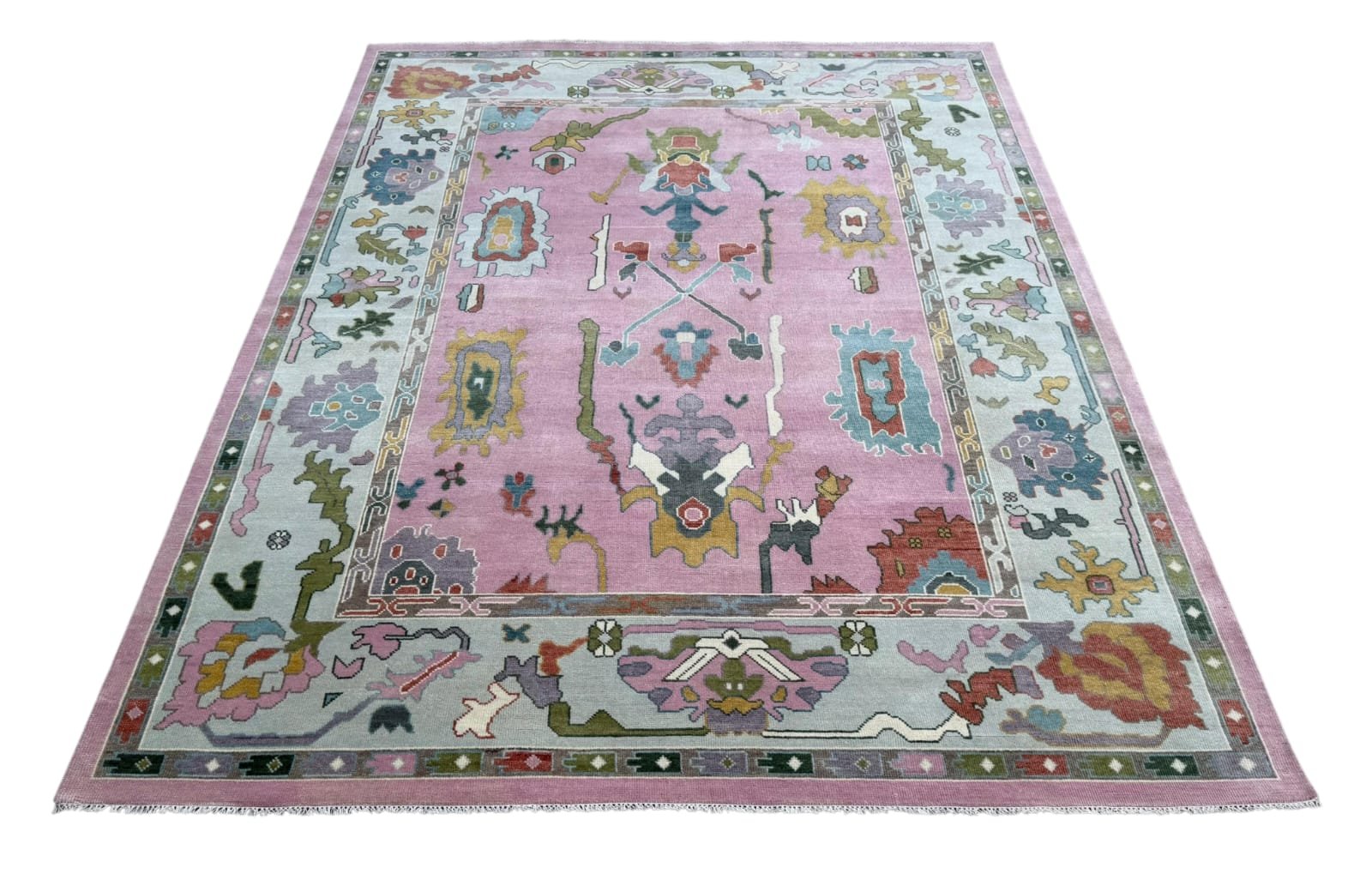 The Maribel Blush Oushak Rug is hand-knotted from premium New Zealand wool, featuring a soft blush pink field framed by a powder blue border with playful multicolor motifs. Its bold yet airy design blends traditional Oushak elements with a fresh, modern palette, creating a statement piece that still feels light and inviting. Perfect for bedrooms, living spaces, or creative interiors, this rug adds warmth, texture, and an effortlessly curated look.