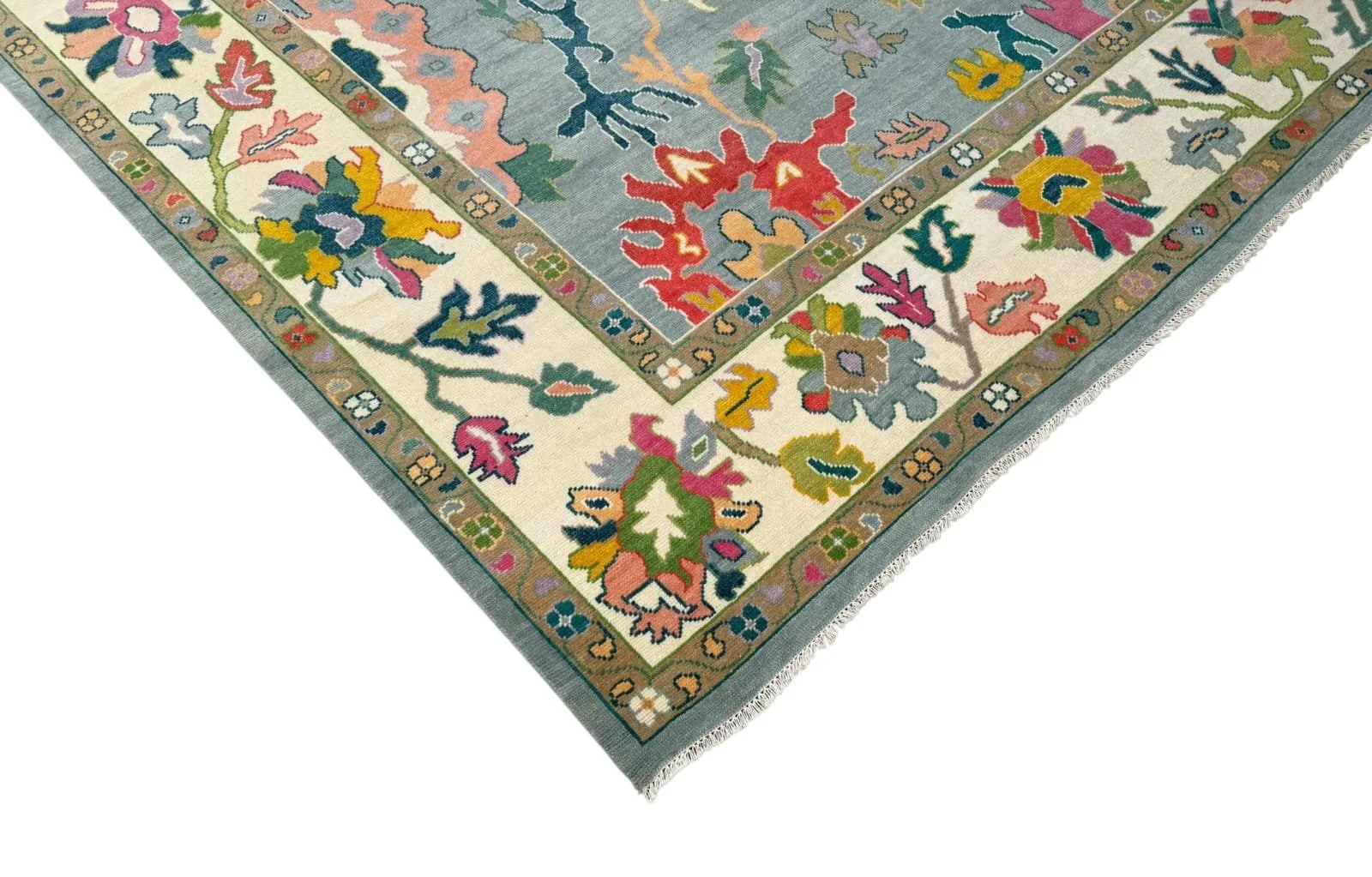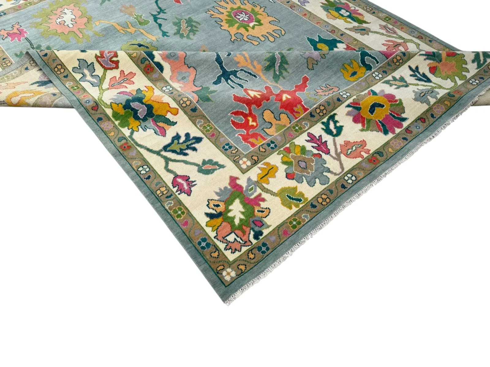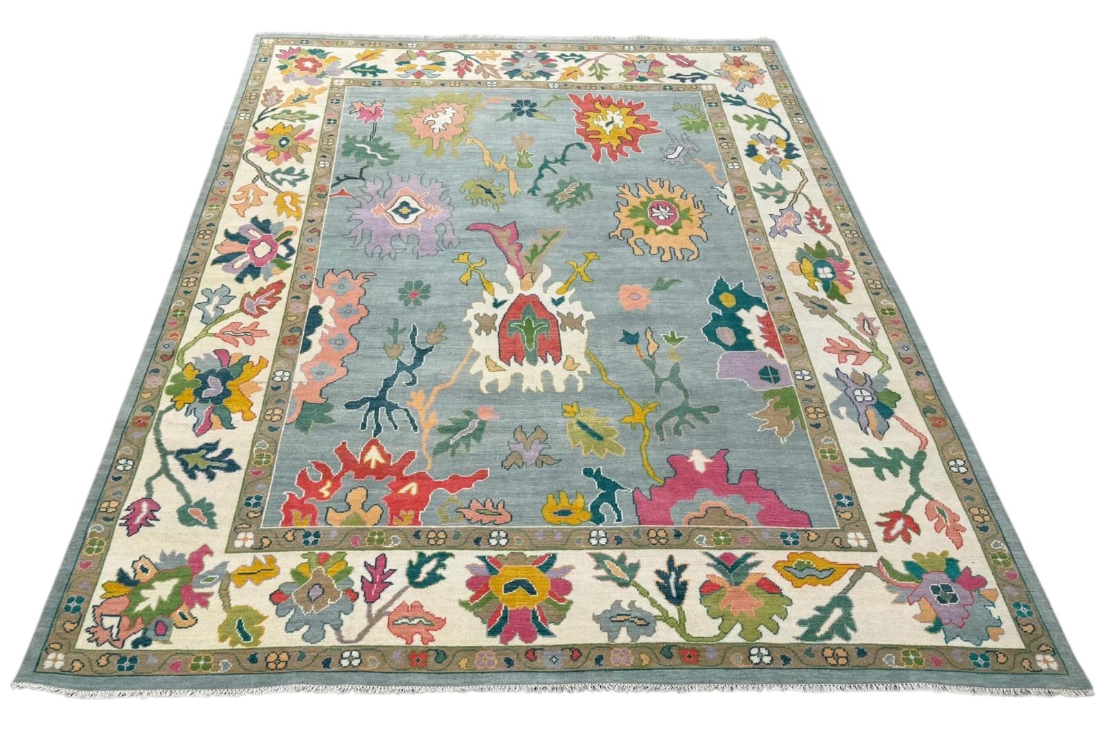 Make a statement with the Isadora Oushak Rug, a vibrant and artful piece inspired by traditional Turkish design with a bold, expressive twist. Featuring a soft blue field framed by an ivory border, this rug is brought to life with an eclectic mix of floral and geometric motifs in rich coral, golden mustard, sage green, blush, and teal tones. The dynamic color palette and intricate detailing create a layered, eye-catching look that adds depth and personality to any space. Handwoven for durability and a soft feel underfoot, the Isadora Oushak Rug is perfect for living rooms, bedrooms, or curated interiors seeking a unique, elevated focal point.