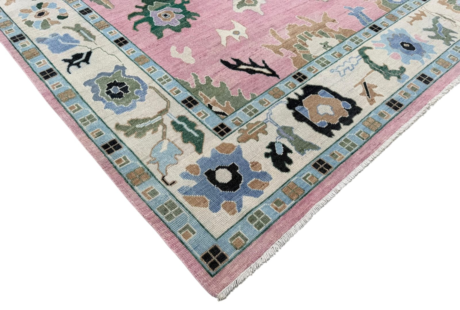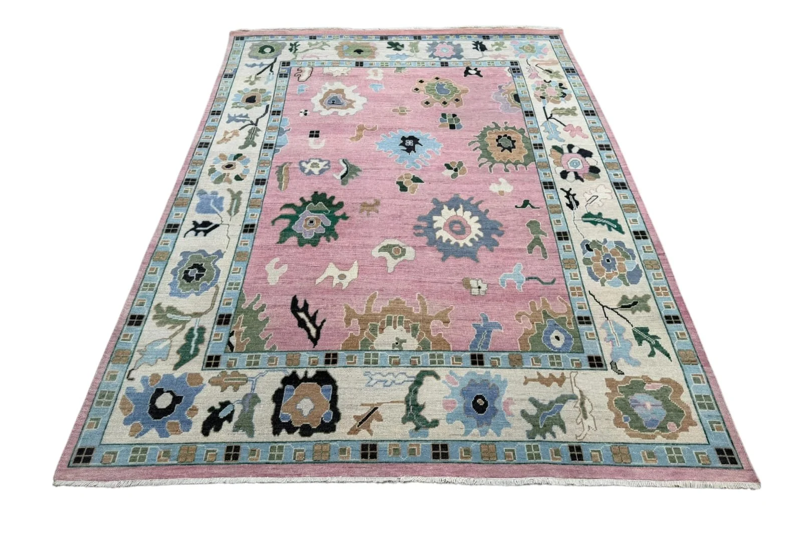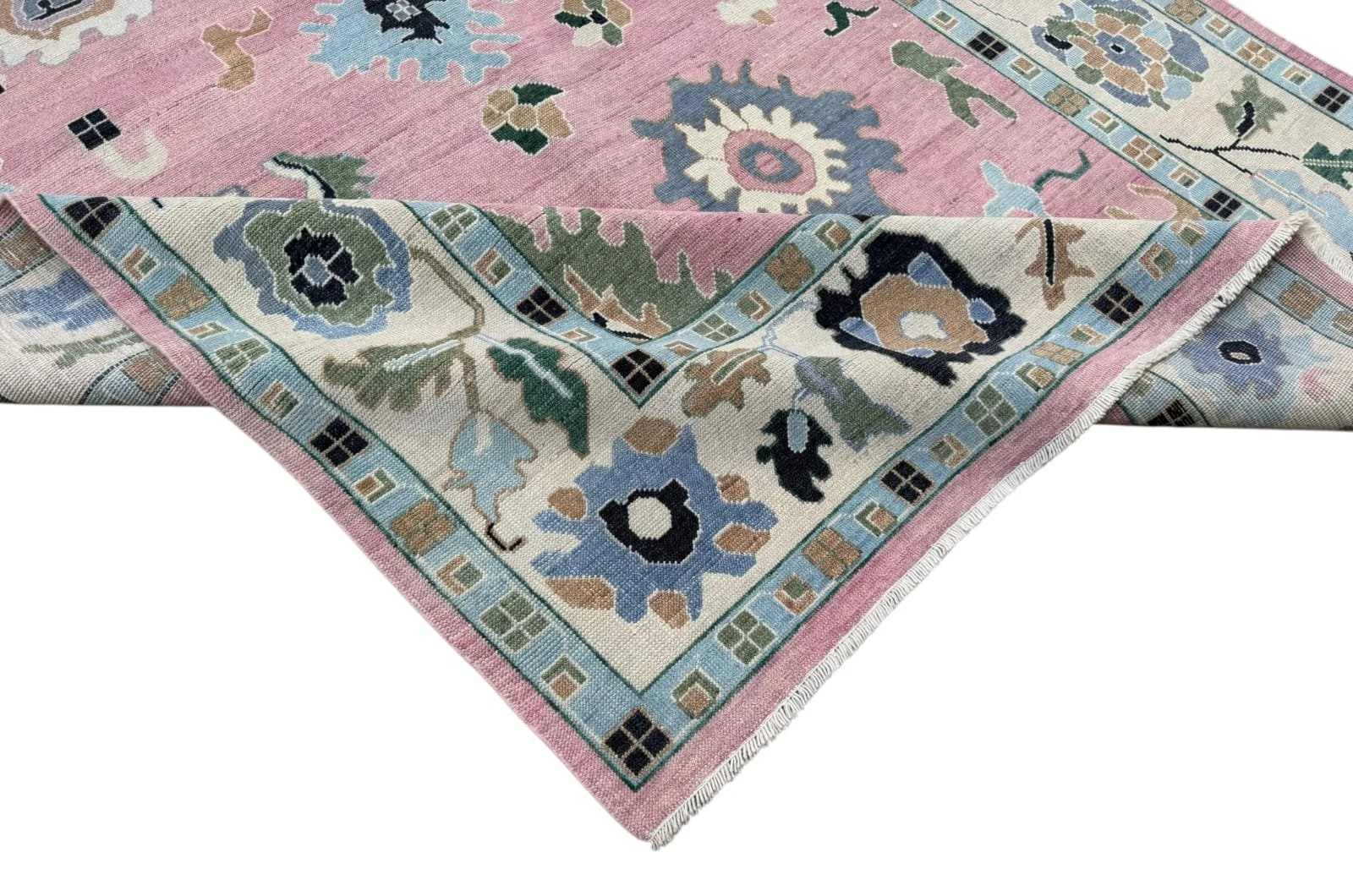 Add a refined pop of color to your space with the Vivienne Oushak Rug, a timeless piece inspired by classic Turkish design. Featuring a rich dusty rose field framed by a soft sky-blue border, this rug is adorned with intricate floral and geometric motifs in sage green, muted gold, and subtle charcoal tones. The balanced contrast and elegant detailing create a warm, sophisticated look that feels both vintage and fresh. Handwoven for durability and a soft, comfortable feel underfoot, the Vivienne Oushak Rug is perfect for living rooms, bedrooms, or styled spaces seeking a touch of character and charm.