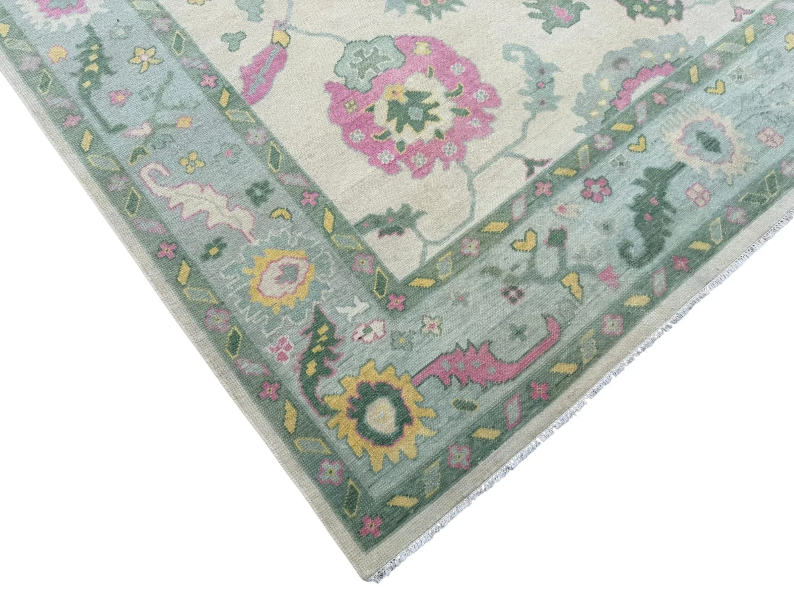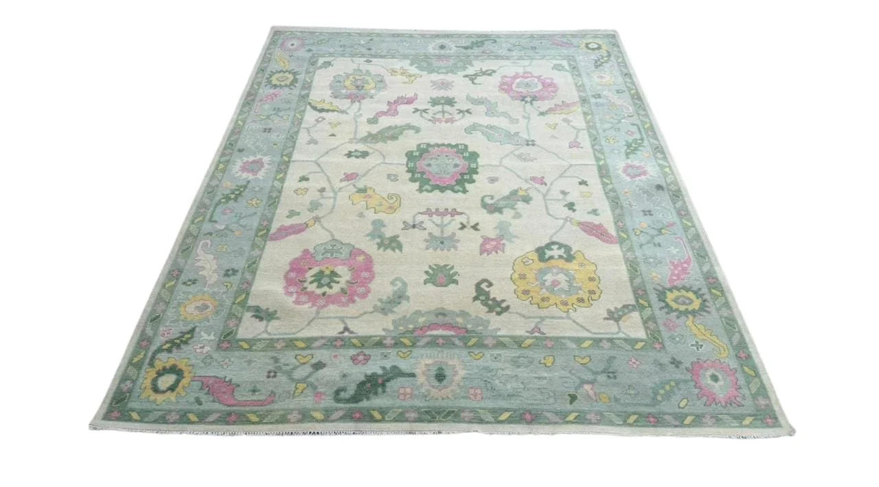 Bring a soft, romantic touch to your home with the Dahlia Oushak Rug, a beautifully crafted piece inspired by timeless Turkish design. Featuring a gentle ivory field framed by a serene sage-green border, this rug is adorned with delicate floral and geometric motifs in blush pink, buttery yellow, and soft green tones. Its light, airy palette and intricate detailing create a fresh, garden-inspired feel that brightens any space. Handwoven for durability and a plush feel underfoot, the Dahlia Oushak Rug is perfect for bedrooms, living rooms, or any space seeking a calm, elegant atmosphere.