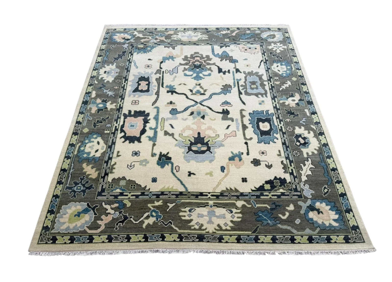 Elevate your space with the understated elegance of the Sloane Oushak Rug, a refined piece that blends classic Turkish design with a modern, tailored feel. Featuring a soft ivory field framed by a deep charcoal and muted olive border, this rug is accented with calming shades of blue, sage, and subtle beige. Its tonal palette and intricate motifs create a balanced, sophisticated look that feels both grounded and effortlessly chic. Handwoven for durability and a soft, comfortable feel underfoot, the Sloane Oushak Rug is perfect for living rooms, bedrooms, or spaces that embrace a quiet, elevated aesthetic.
