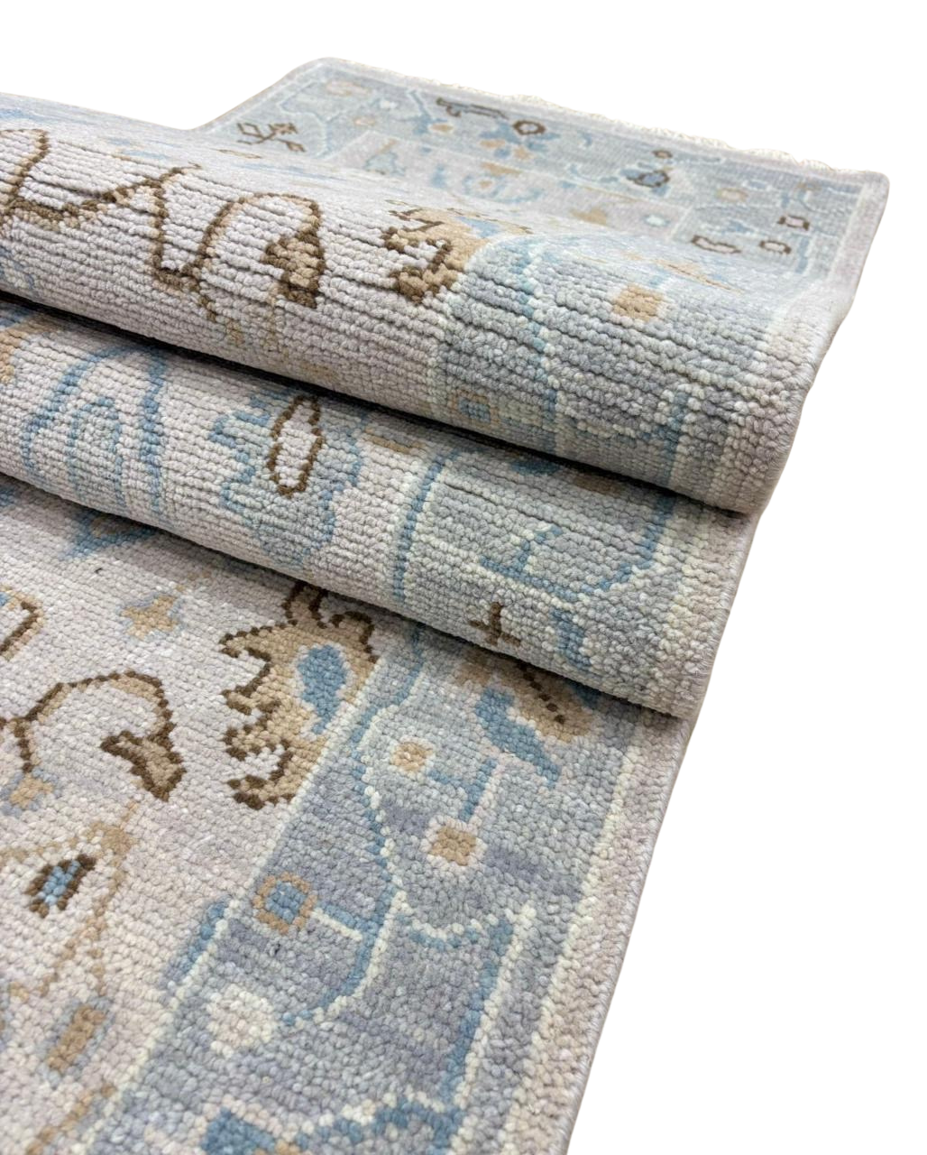 Bring effortless elegance to your space with the Margot Oushak Rug, a beautifully understated piece inspired by classic Turkish design. Featuring a soft, faded palette of dusty blue, warm ivory, and subtle beige accents, this rug showcases delicate geometric and floral motifs with a gently timeworn look. Its muted tones and airy feel create a calm, lived-in aesthetic that blends seamlessly with both modern and traditional interiors. Handwoven for durability and a soft feel underfoot, the Margot Oushak Rug is perfect for living rooms, bedrooms, or spaces that embrace a relaxed, refined style.